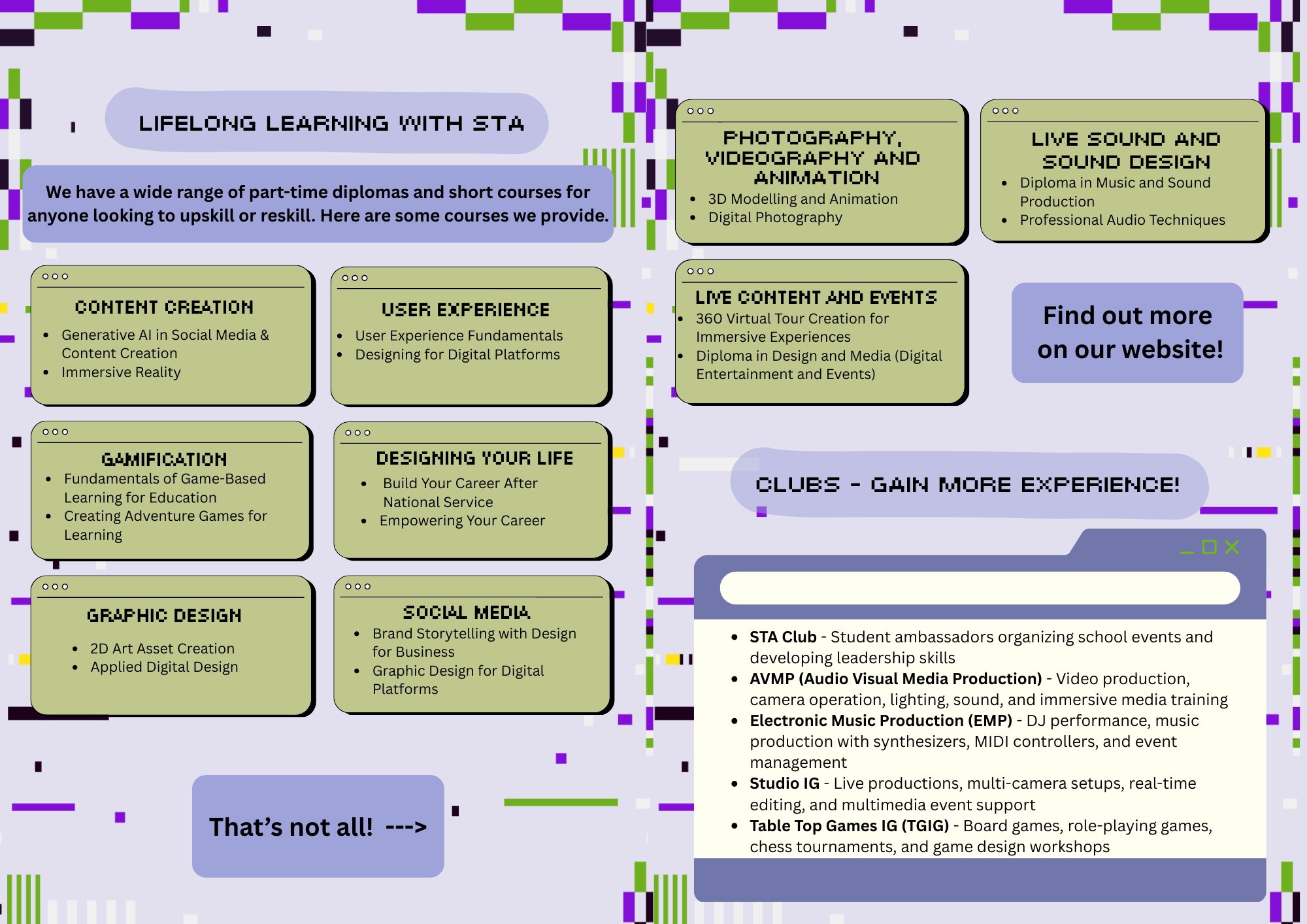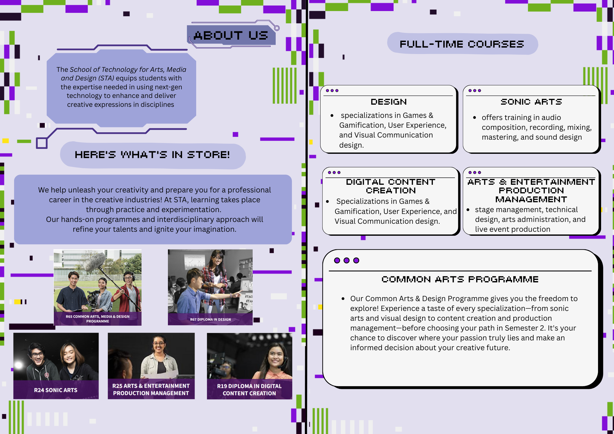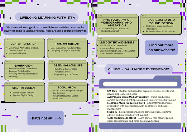 This project developed two STA marketing campaigns: one targeting secondary school and ITE graduates showcasing creative learning and student life, and another for working adults promoting CET upskilling courses. We created engaging videos, designs, and templates for both audiences to attract attention on social media and at open house events.